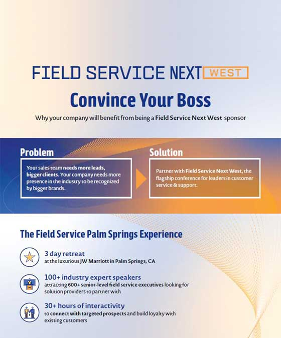 Gain direct access to 400+ field service professionals, including the industry’s most powerful decision-makers. Field Service is the ultimate place to amplify your brand.